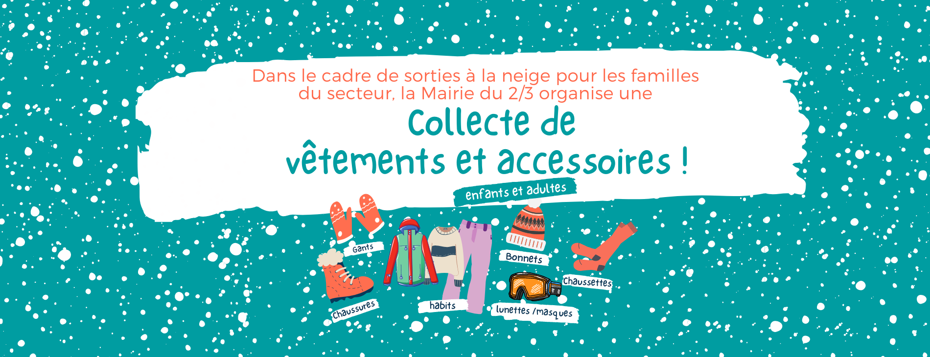 Dans le cadre de nos sorties enfants et familles à la neige, votre Mairie de secteur organise une collecte de vêtements et accessoires (enfants et adultes)