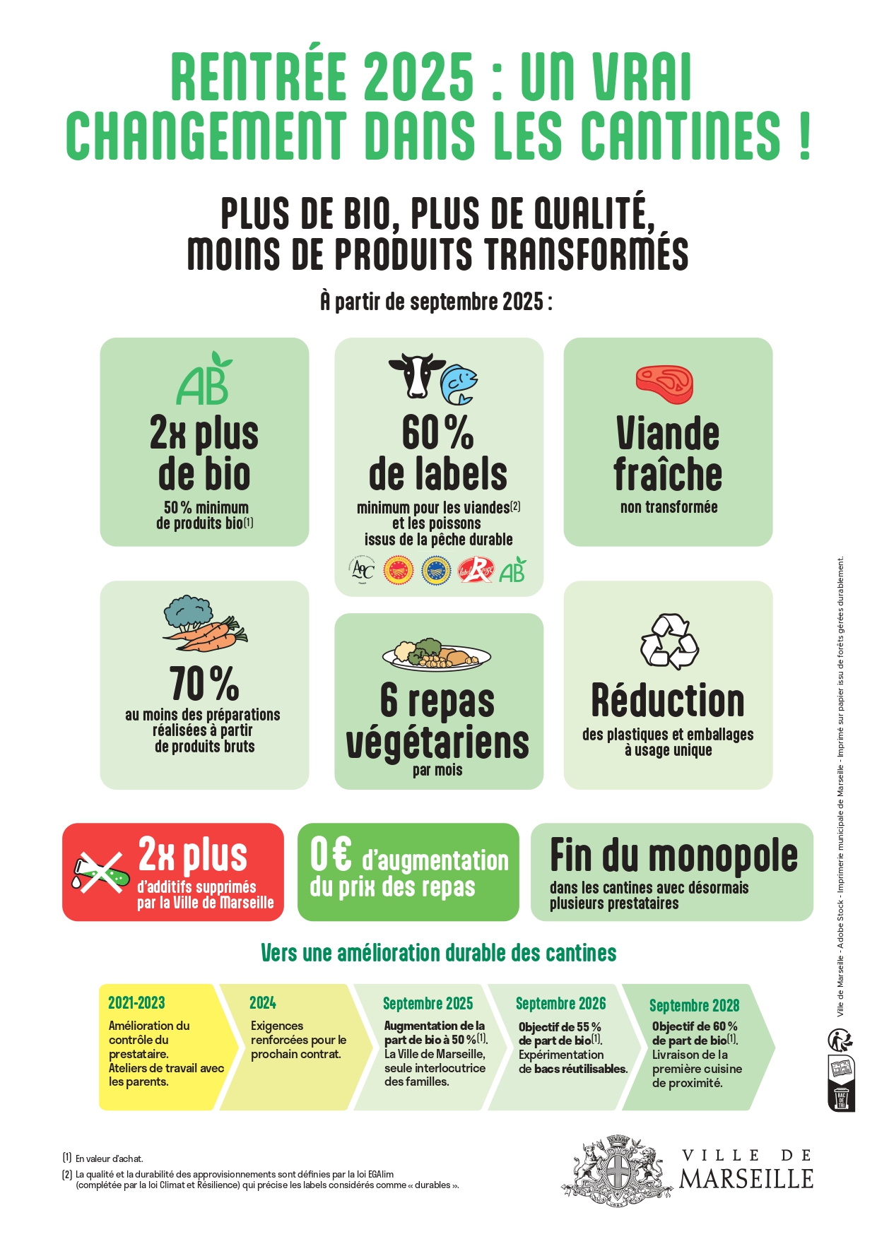 Dès septembre 2025, les cantines marseillaises évoluent avec plus de bio, moins de plastique et une alimentation plus équilibrée pour la santé des enfants. Une cuisine de meilleure qualité, plus respectueuse de la santé et de l’environnement, sans augmentation du prix des repas !